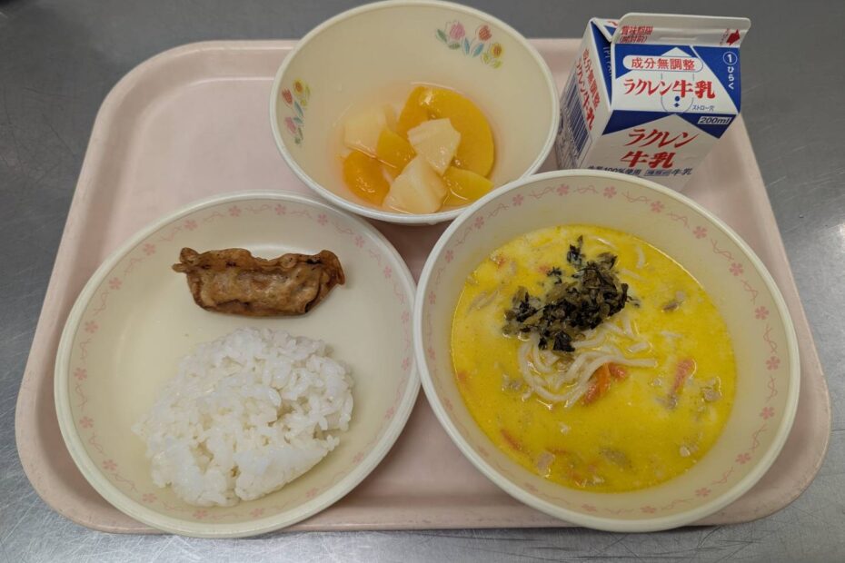 昨日、給食週間のメニューの紹介を始めましたが、第1日目の給食の画像をアップしていませんでした。これが、「高菜漬け」が入った「とんこつラーメン風」です。繰り返しますが、とってもおいしかったです。