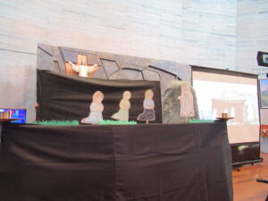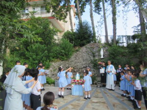 聖堂では、宗教委員会のみなさんがペープサート劇「聖ベルナデッタ物語」を披露しました。そして、マリアさまの神輿を担いで本校のルルドに行きました。ルルドでは、みんなでお祈りをして聖歌を捧げました。聖ベルナデッタのような清く美しい心になりたいものです。
