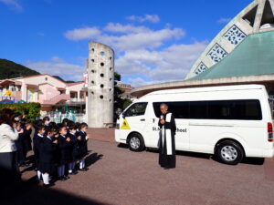 新しいスクールバスの祝別式2025年11月28日 スクールバスに、新しいバス(ワゴンタイプ)が追加されました。12月からの運行を前に、理事長神父様に祝別式を執り行っていただきました。みんなが安全に登下校できますように…。
