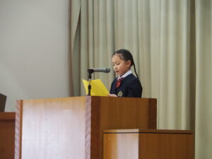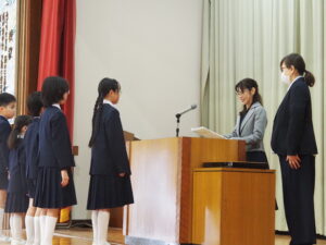 令和7年度修了式がありました。令和7年度の1年間の頑張りと、令和8年度での進級を校長先生から認めていただきました。その後、児童代表の2人が3学期を中心に1年間を振り返る発表をしてくれました。校長先生からは、令和8年度のスタートでの目標を用意しておくようにと,春休みの宿題をいただきました。