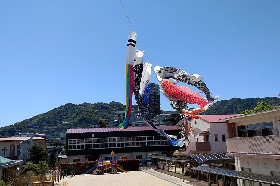マリアの丘では、鯉のぼりが泳ぎ始めました。甍の波や雲の波は見えませんが…、稲佐山をバックに澄んだ青空の中を気持ちよさそうに泳ぎ始めました。子どもたちも、うれしそうに鯉のぼりを見上げていました。 ※1… 続きを読む »高く泳ぐや鯉のぼり